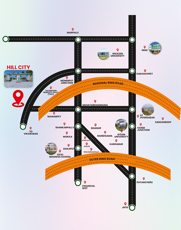 The Hill City project boasts exceptional connectivity by Roadways and Railways and is in close proximity to the International airport. Finding gated community plots in Hyderabad is difficult because of the proximity to the airport. It is also close to the proposed RRR, MNCs, IT SEZs, Educational Institutions, Reputed Multi Speciality Hospitals, Government Offices, and Tourism Spots.